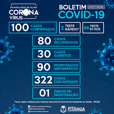 Segundo informações da Secretaria Municipal de Pitanga, o município chegou ao 100° caso positivo de coronavírus nesta terça-feira (21), sendo 02 casos confirmados através de teste rápido e 98 através de teste RT-PCR.
