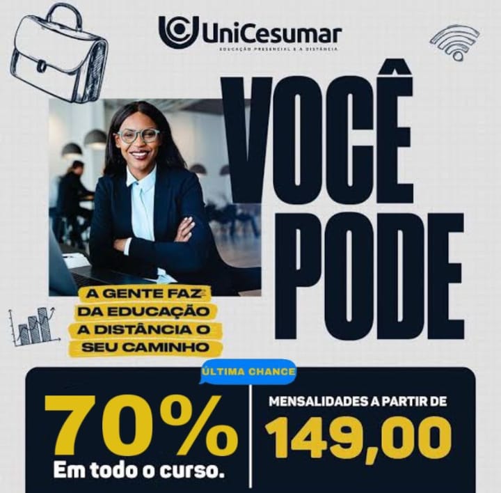 A Unicesumar de Palmital oferece cursos com 70% de desconto e primeira mensalidade gratuita (não paga). A partir da segunda mensalidade apenas R$ 149,90, com material didático incluso.