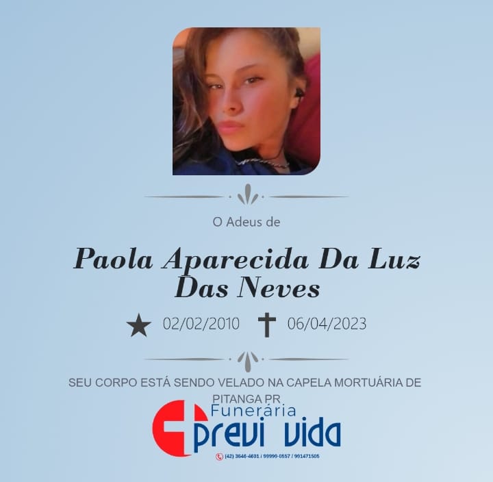 Com profundo pesar a Funerária Previ Vida comunica o falecimento de Paola Aparecida da Luz das Neves, aos 13 anos de idade. Vítima de acidente de trânsito na noite desta quinta-feira (6), na PR-466, próximo ao trevo de acesso à Santa Maria do Oeste.