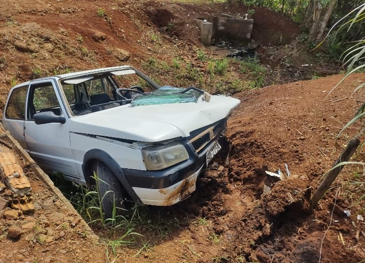 O condutor de um Fiat/Uno perdeu o controle da direção e acabou caindo dentro de uma vala.