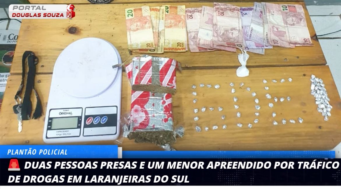 Na tarde desta sexta-feira (28 de novembro), a PolÃcia Civil de Laranjeiras do Sul prendeu dois maiores e lavrou um BOC contra uma menor, todos envolvidos envolvidos com o tráfico de drogas. A operação teve inÃcio após investigações que indicaram atividades ilÃcitas em uma residência localizada na Avenida Santos Dumont.